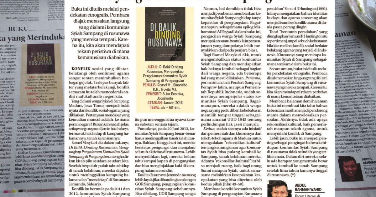 Romel Masykuri dkk dalam bukunya, Di Balik Dinding Rusunawa; Mengungkap Pengalaman Komunitas Syiah Sampang di Pengungsian, menghadirkan kisah pilu saudara-saudara kita. Setelah berpuluh-puluh tahun hidup di tanah kelahiran, mereka dipaksa untuk meninggalkan kampung halaman dan ’’mendekap’’ di Rusunawa Jemundo, Sidoarjo.